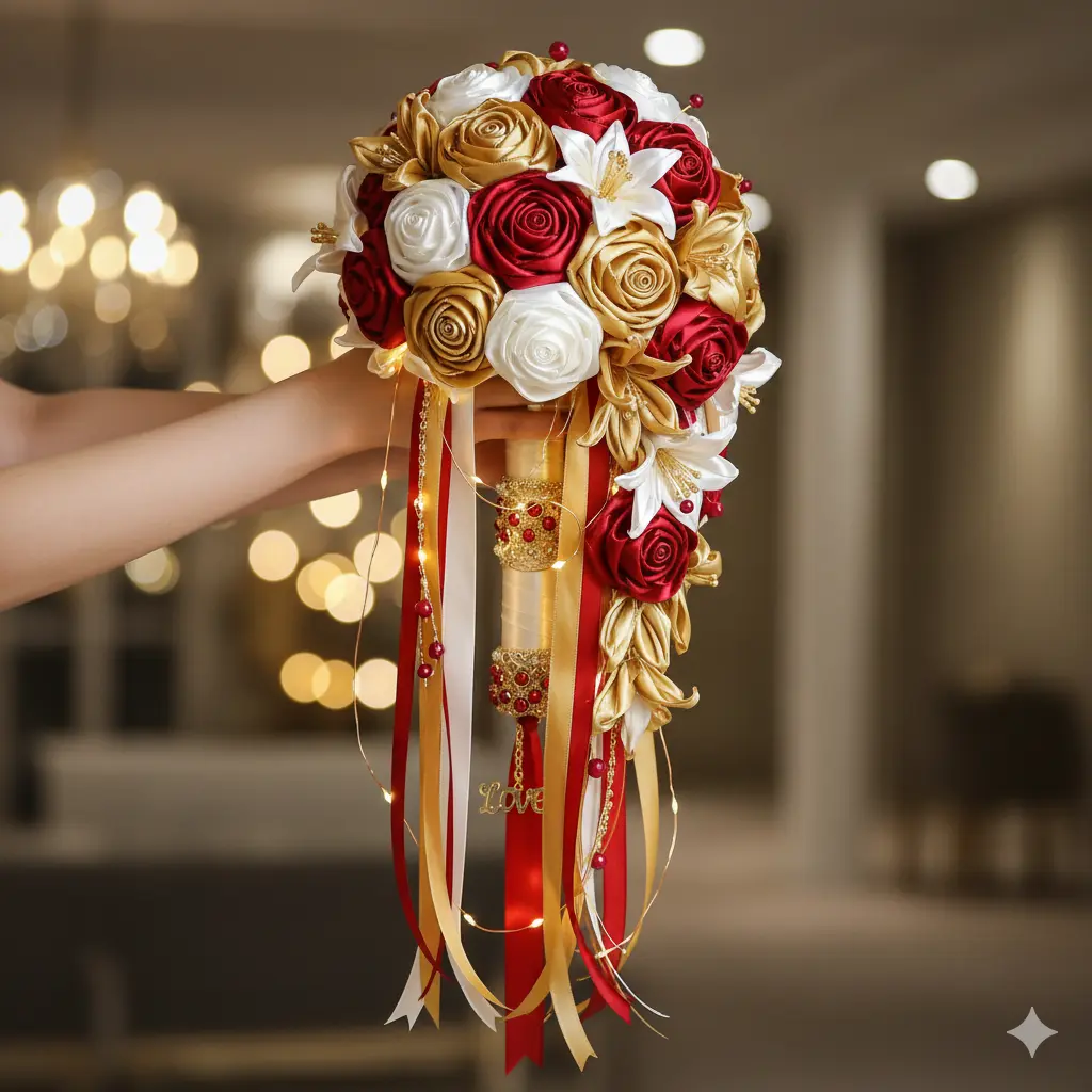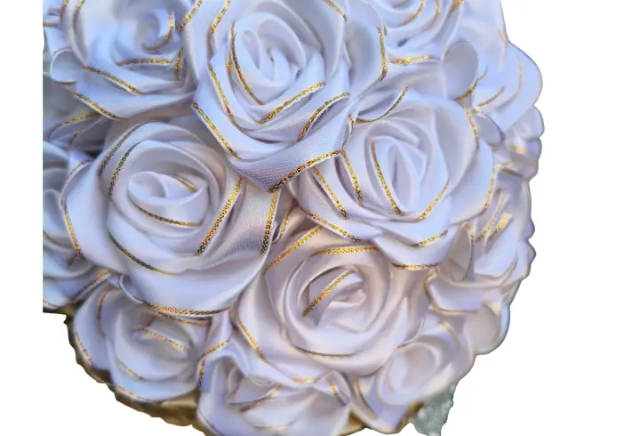 Esqueça o stress de manter flores frescas. este ramo é feito de cetim de alta qualidade em tons clássicos de casamento, branco e dourado, garantindo a sua beleza se mantenha intacta do inicio ao fim do dia.