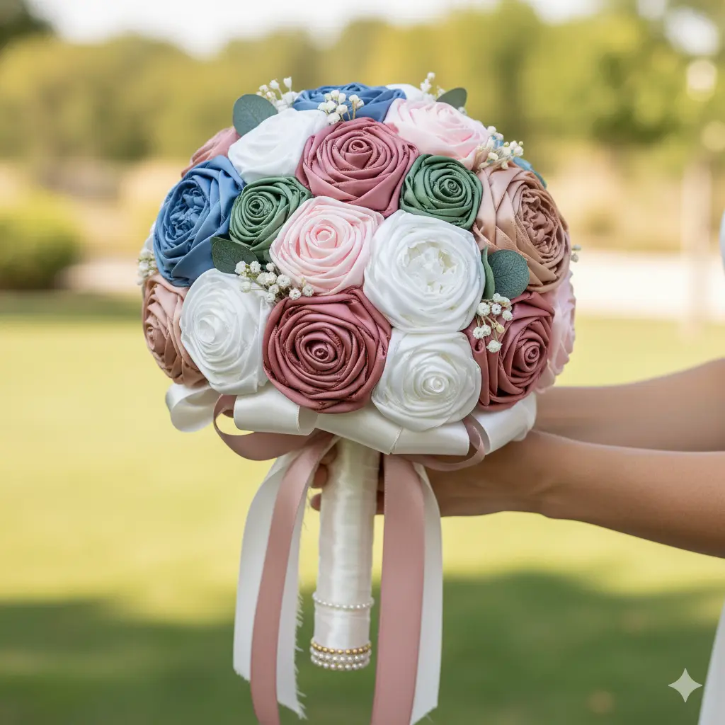 Ramo de noiva, feito á mão em cetim e pérolas.